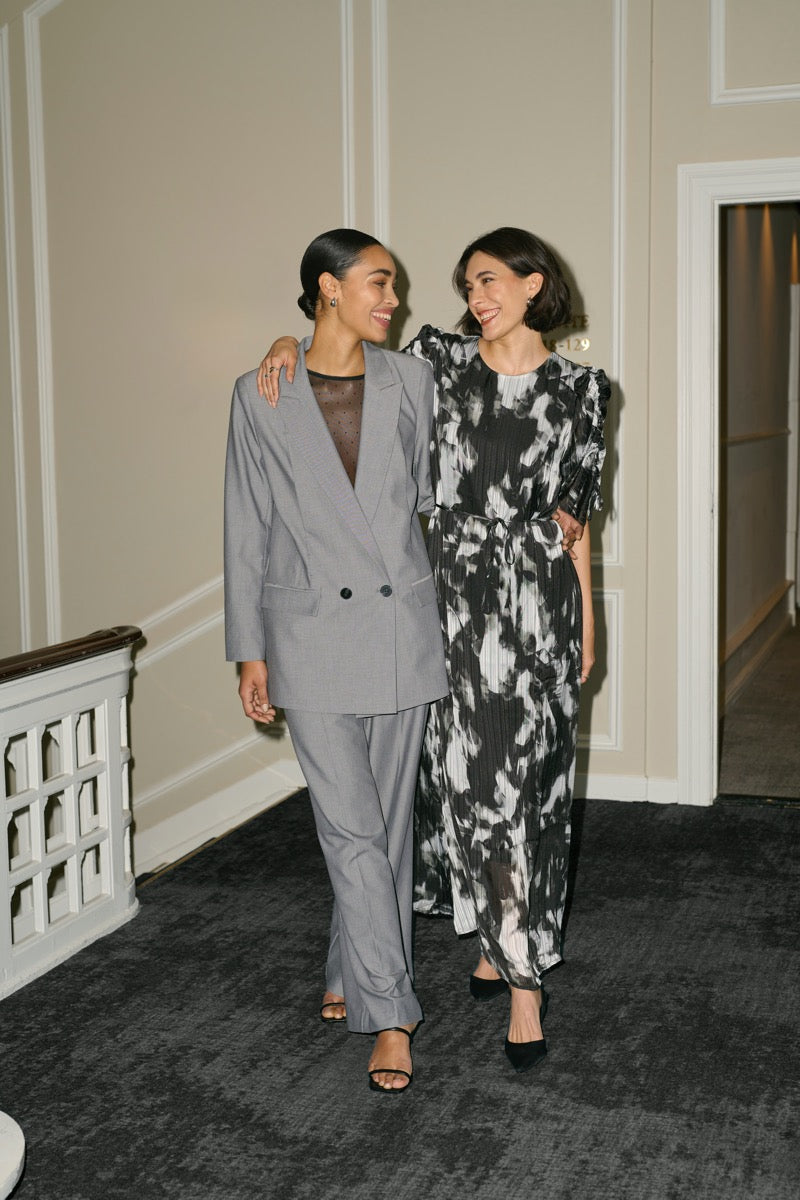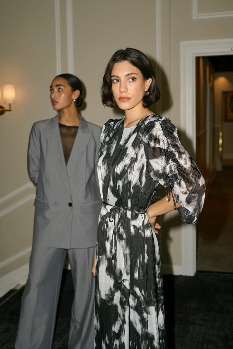 Elegant, lang maxikjole med et abstrakt print fra mærket KAFFE. Lifa kjolen er med selvbindende bælte i taljen, som giver dig en flot silhuet. Den har desuden rund halsudskæring og albuelange ærmer med snøre.
