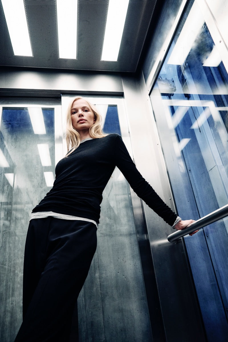 Sorte, tidløse bukser med høj talje fra Karen By Simonsen i modellen Ro. Bukserne er bløde. De har vide ben, læg foran og bindebælte i taljen, som sikrer både komfort og stil.